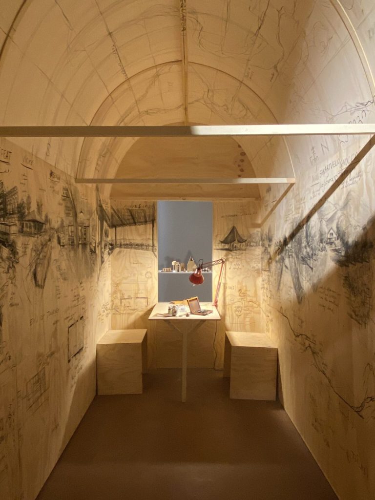 Una scenografia in legno – analoga a quella di uno studiolo rinascimentale – in cui ornamenti e decorazioni corrispondono alla manifestazione di un mondo invisibile, uno spazio mentale costituito da parole e ricordi, tradotti in immagini e rivitalizzati dal segno grafico dell’artista.
